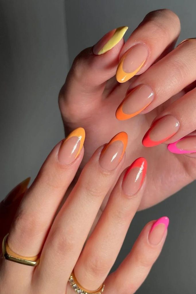 Try rainbow tips with different colours on each nail. Fun, vibrant, and perfect for festivals or vacations.