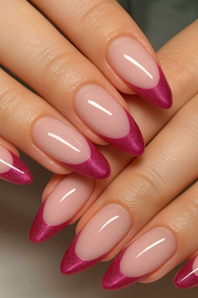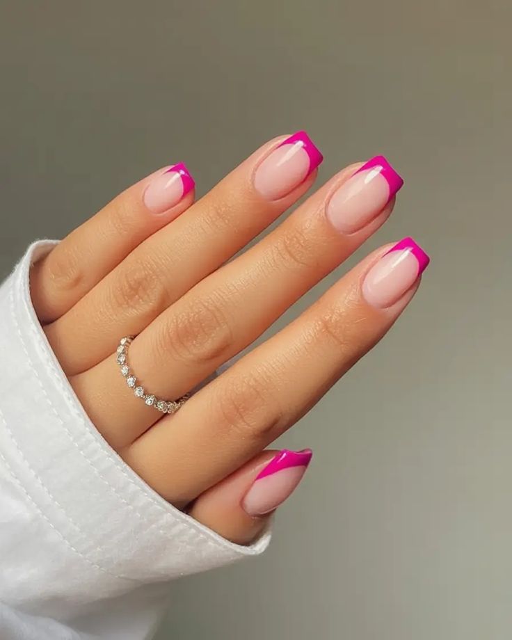 Hot pink tips add a fun, youthful feel. They work best on almond or square nail shapes.